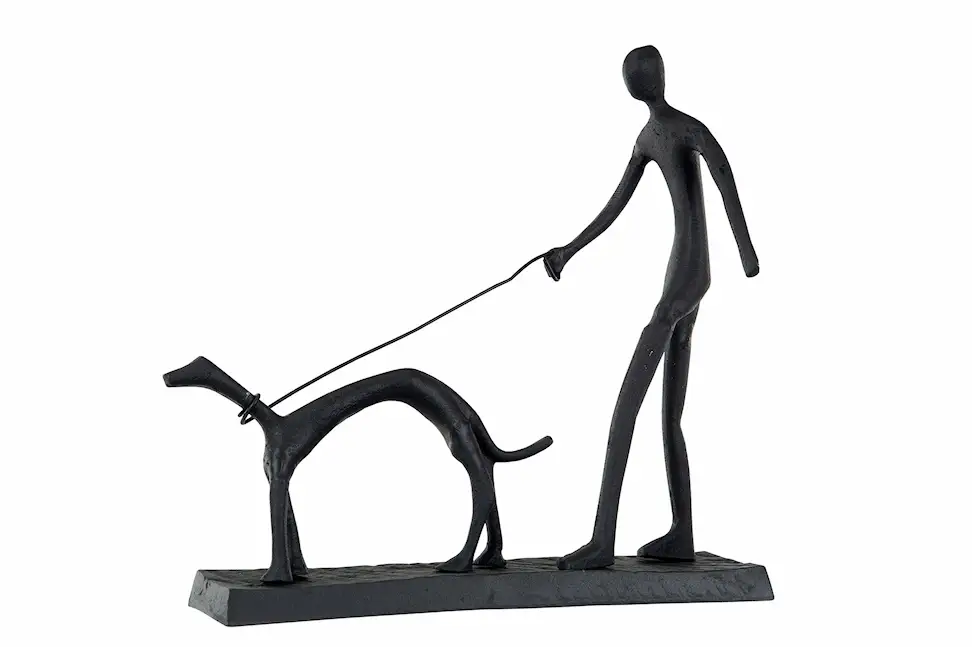 Dekoration med en man och en hund. Perfekt att ha på soffbordet eller en bänk. Tillverkad av poly.