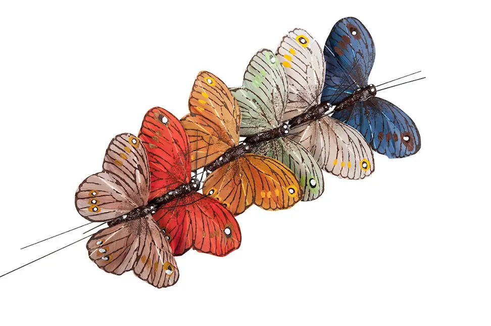 Färgglada fjärilar på pinne som är perfekta som dekorationer i en krukväxt eller något annat arrangemang. Tillverkade i fjädrar.