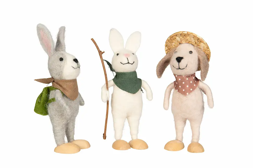 Två kaniner och en hund klädda för en dag utomhus, gjorda av ull. Perfekt när du vill ha en rolig dekoration eller ett lekfullt blomsterarrangemang.