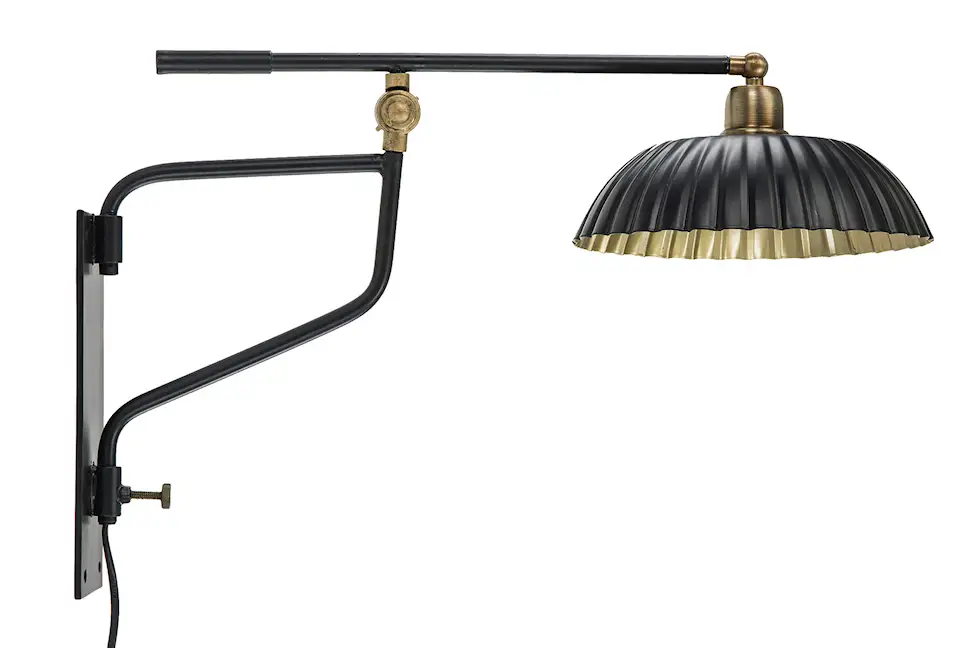 Vägglampa med en justerbar skärm, tillverkad i metall. Perfekt att ha på väggen vid läsfåtöljen.