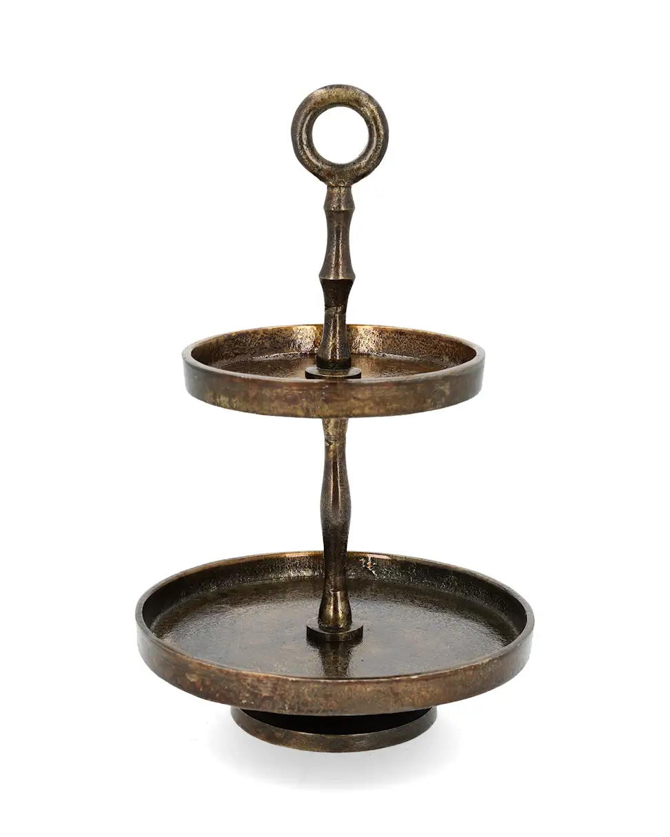 Våningsfat i två nivåer och ett handtag upptill. Gör det enkelt att sätta fram blommor och ljus på ett vackert sätt. Tillverkat i metall.
