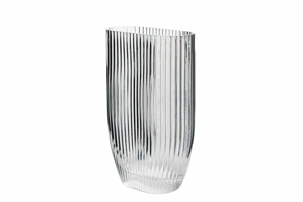 För dig som älskar att ha blommor och buketter hemma finns denna ovala vas med ränder. Tillverkad i glas.