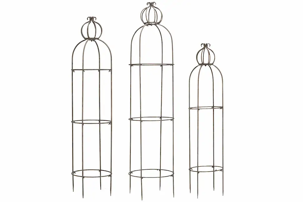 Set om tre växtstöd med vacker krona på toppen. Perfekta att sätta i krukor med växter som klättrar eller behöver stöd. Tillverkade i metall.